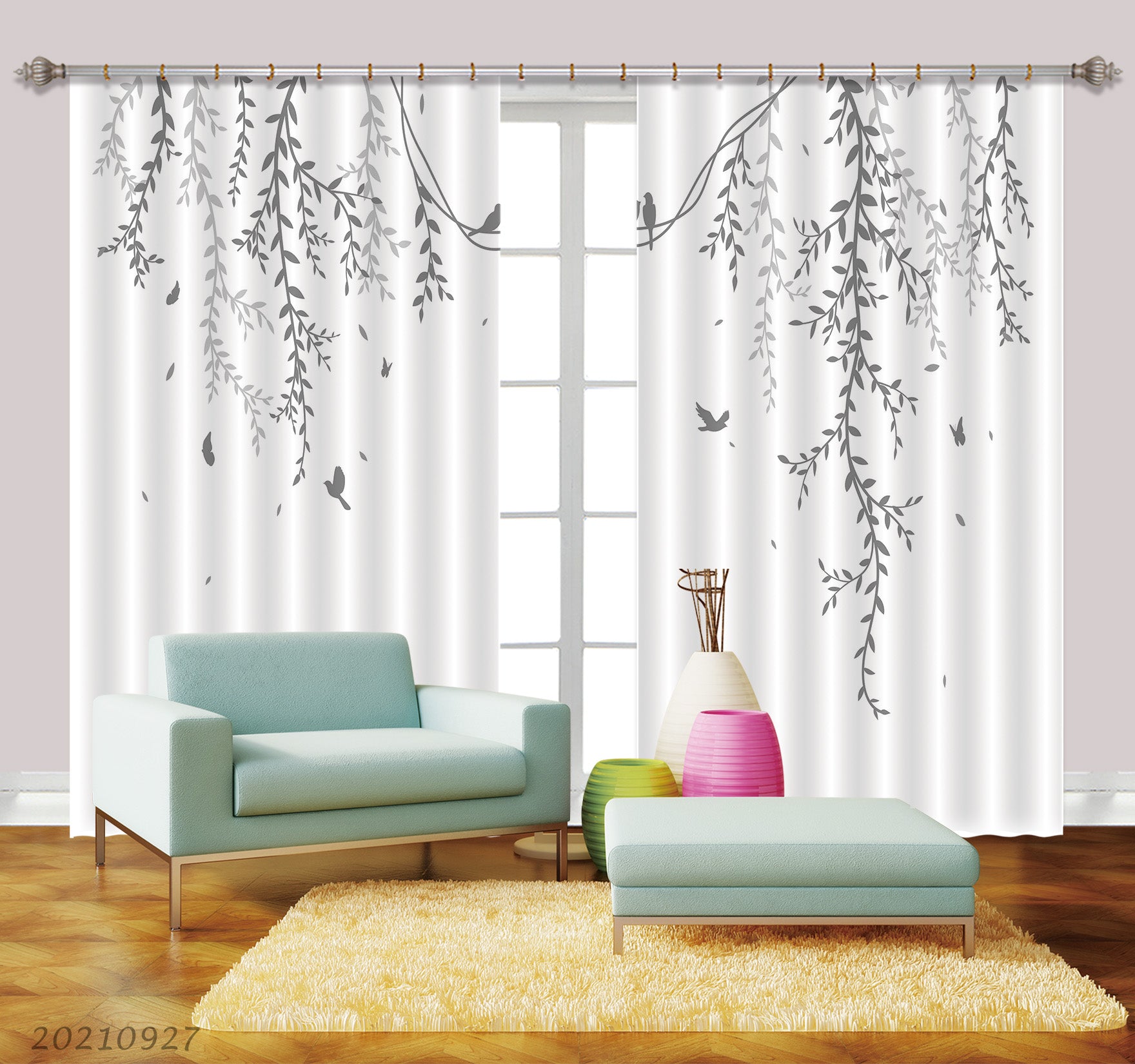 3D Watercolor Grey Leaf Bird Curtains And Drapes Lqh 167
