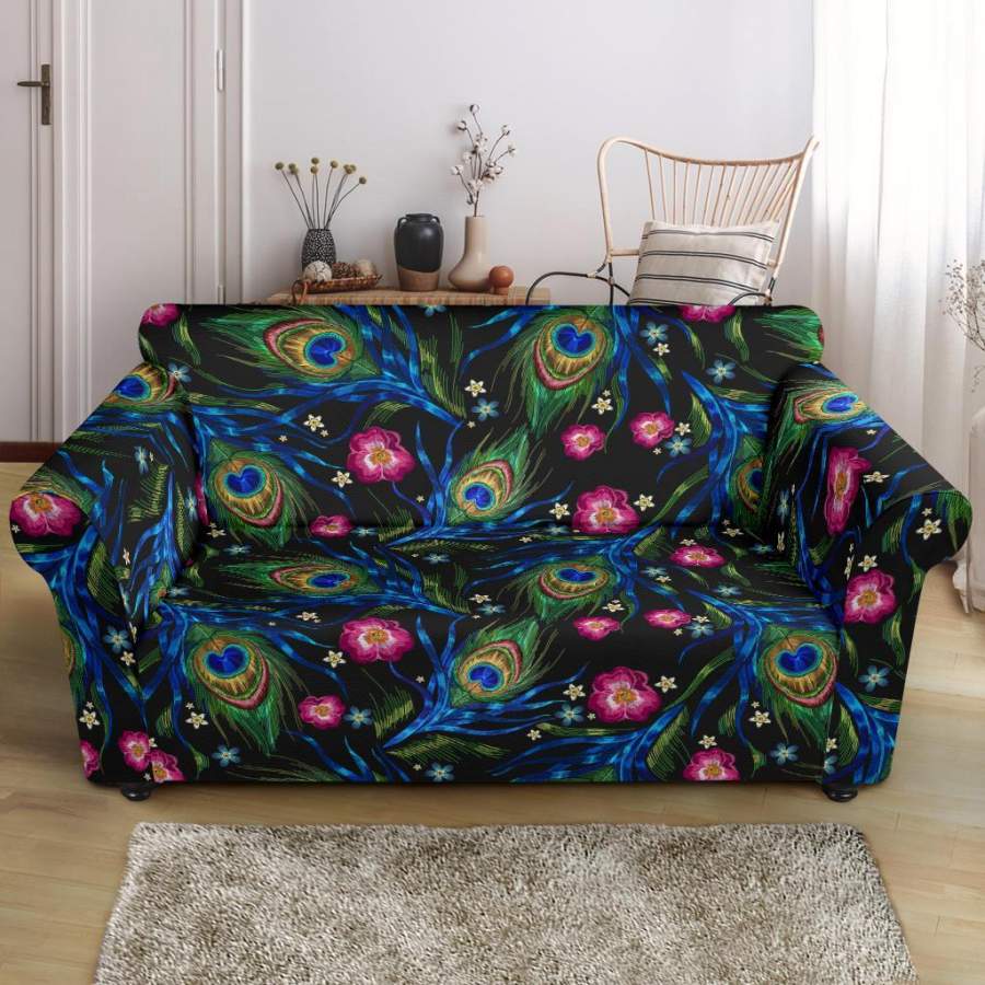 Peacock Rose Feather Pattern Print Loveseat Cover