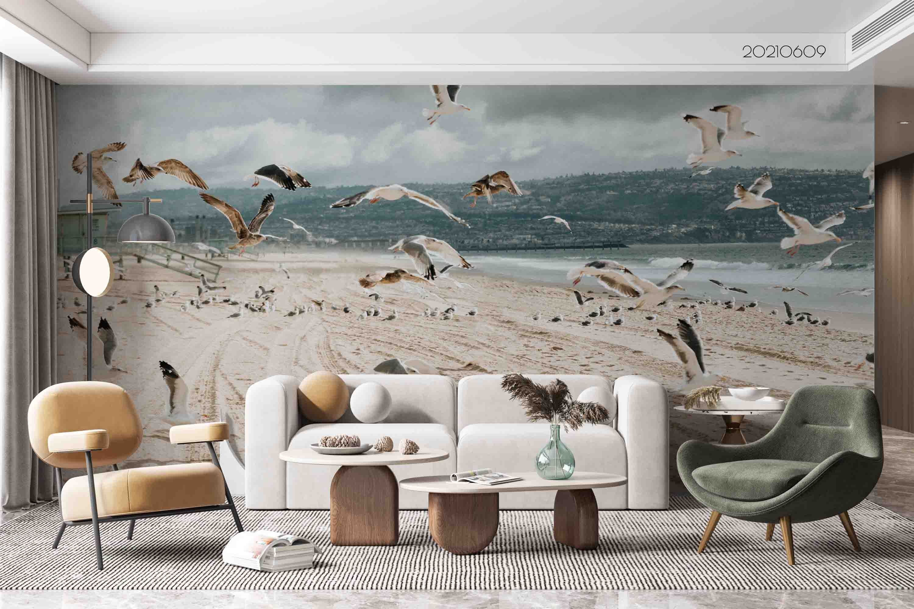 3D Beach Bird Sea Gull Distant Mountains Wall Mural Wallpaper Sww1707