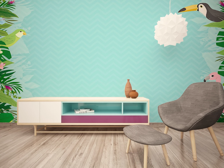 3D Blue Wavy Bird Toucan Floral Plants Leaves Wall Mural Wallpaper Sf661