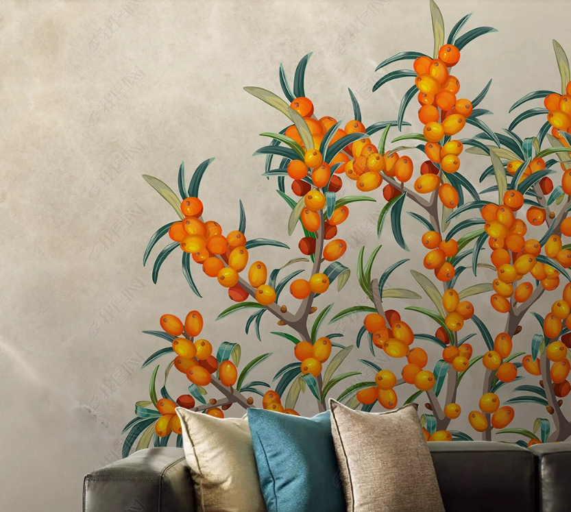 3D Classic Hand Drawn Orange Tree Plant Bird Background Wall Mural Wallpaper Lxl