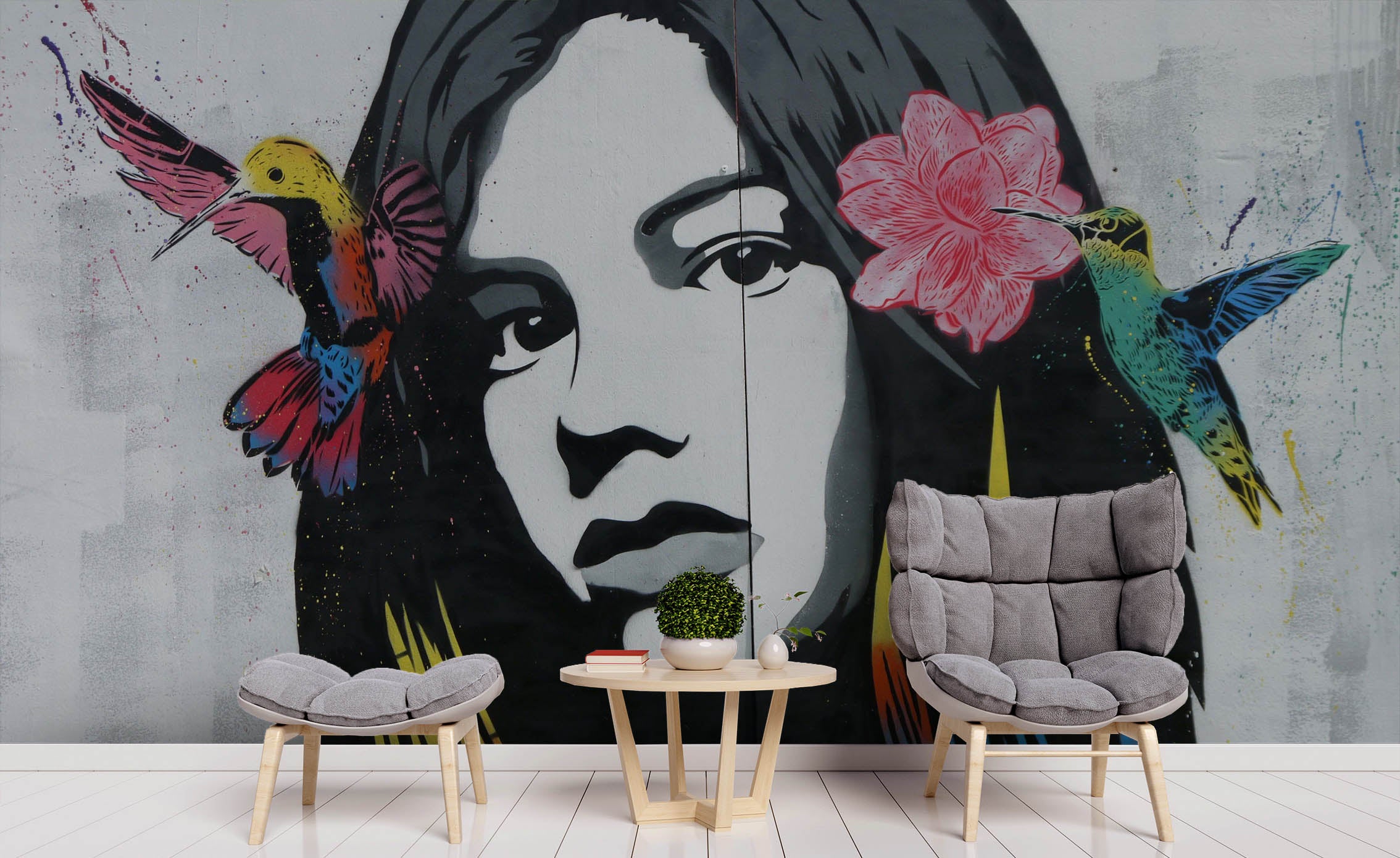 3D Girl Floral Bird Graffiti Wall Mural Wallpaper Sww 36