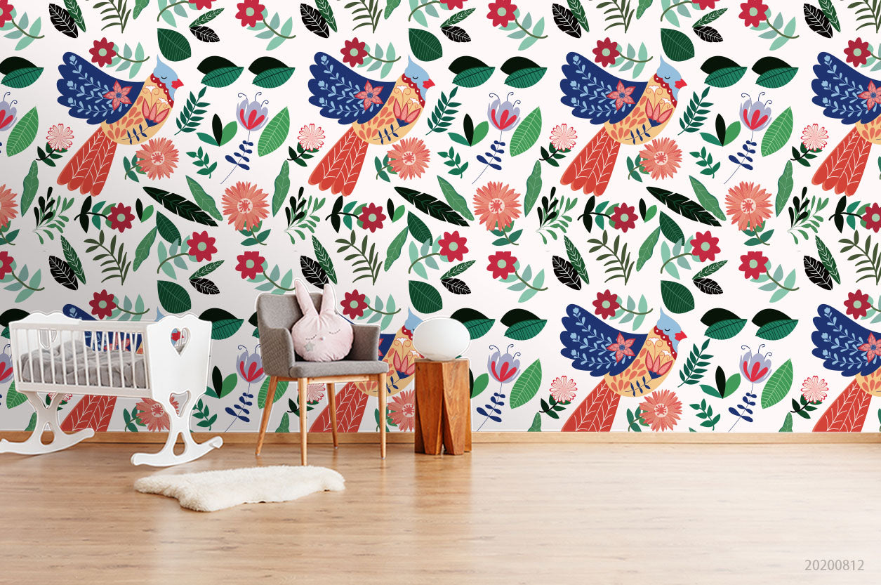 3D Hand Sketching Colorful Bird Floral Leaves Plant Wall Mural Wallpaper Lxl 1073