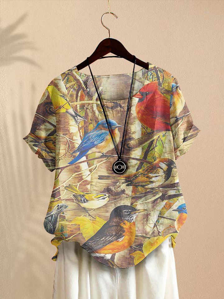 Beautiful Birds In Fall Forest Yellow Casual O Neck Short Sleeve T Shirt