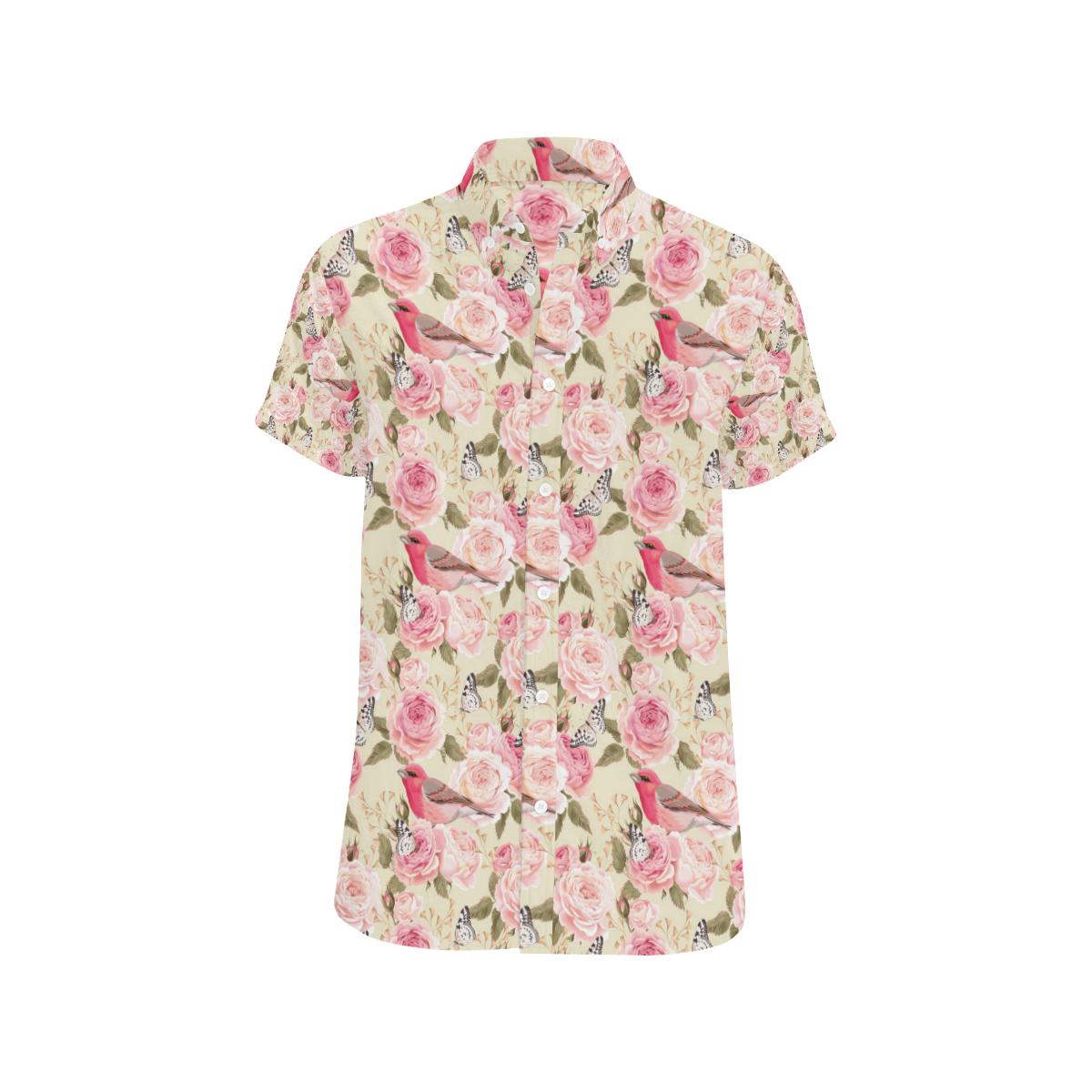 Bird Butterfly Pink Flower Print Pattern Men Button Up Shirt
