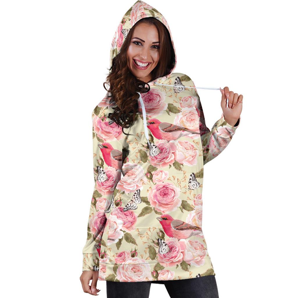 Bird Butterfly Pink Flower Print Pattern Women Hoodie Dress