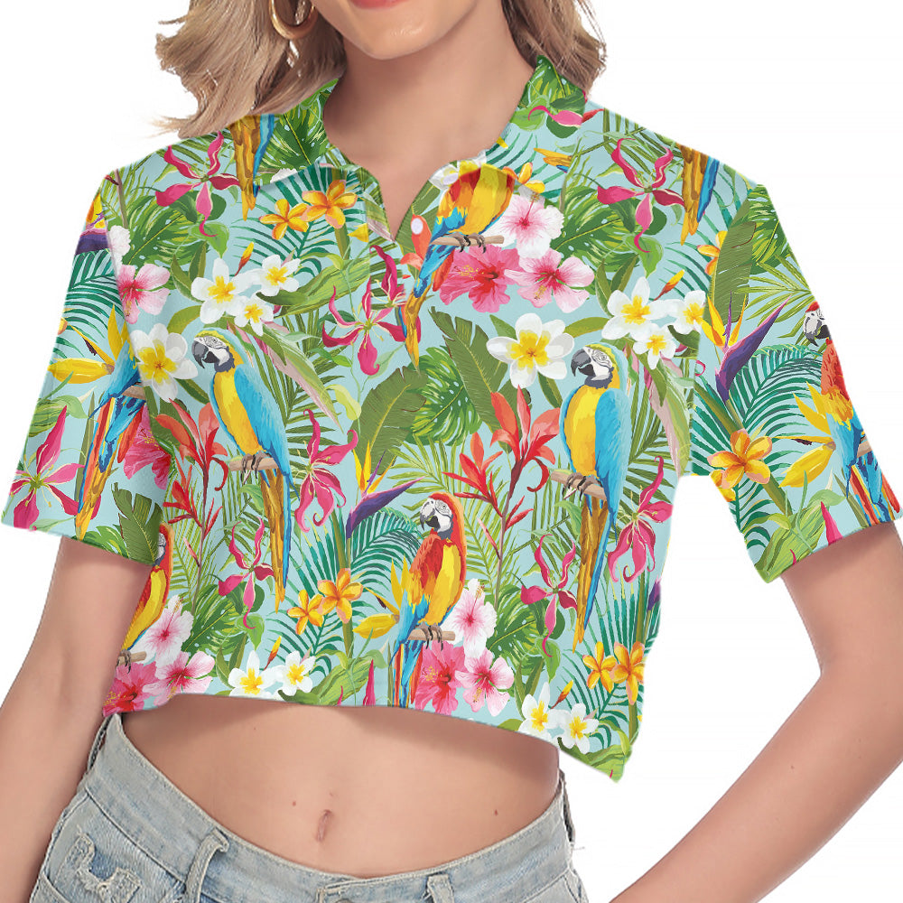Catalina Macaw Parrot And Flowers V-Neck Short Sleeve Cropped T-Shirt