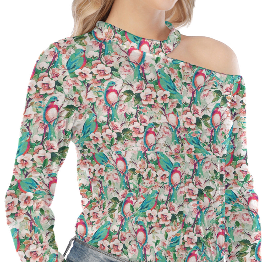 Floral And Sparrow Birds Off Shoulder Knitted Long Sleeve T-Shirt