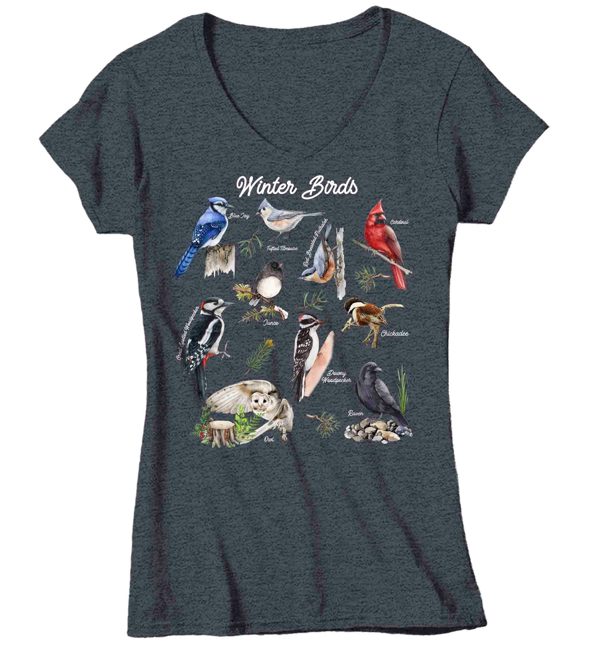 Women’S V-Neck Bird Shirt Winter Birds T Shirt Cardinal Blue Jay Woodpecker Tshirt Bird Watcher Gift Forest Junco Chickadee Graphic Tee Ladies